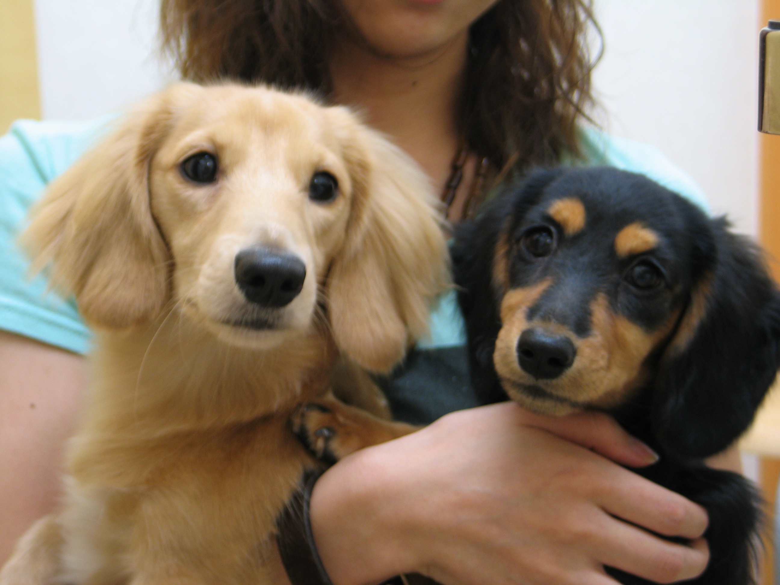 M.ダックスの雷ちゃん(茶の男の子)と妹の月ちゃん(黒の女の子)はとっても仲良しです