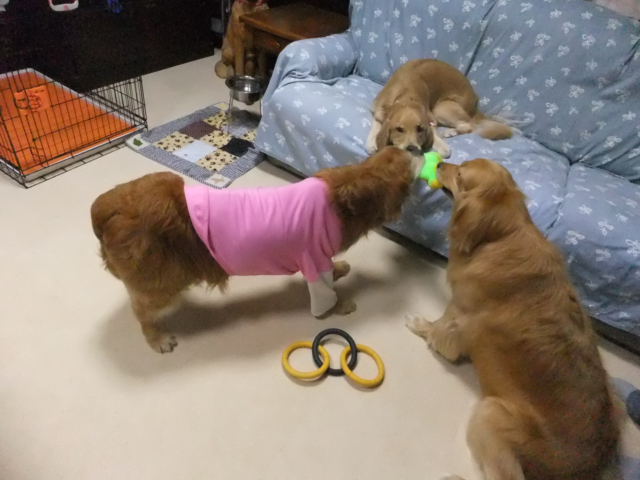ソファに乗っているのが 彩音、ピンクの服を着ているのが デンちゃん、もう1人がレトちゃんです
